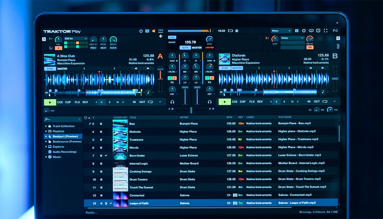 Traktor Play is designed to work right out of the box, using your built-in speakers and trackpad. If you already own a DJ controller, Traktor will automatically detect it and map the controls for you. Plug-and-play support means you can connect hardware at any time without adjusting extra settings.