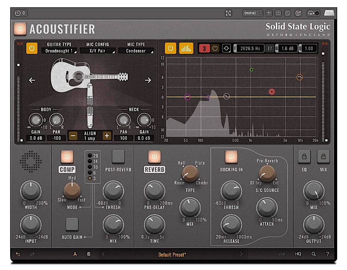 There’s nothing like a great-sounding, well-miked acoustic guitar. It’s a joy to listen to and easy to make fit in the track. That said, there are so many situations today where you just can’t mike an acoustic well, or maybe not at all, which means that you have to rely on the direct output signal if the guitar has one. We all know that usually leads to less than desirable results, but that’s where SSL’s Acoustifier plugin comes in.